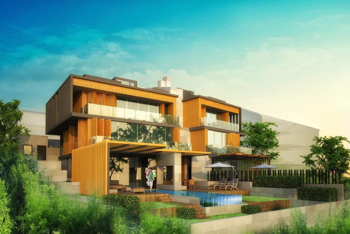 Inventive use of individual modules forms the foundation for Dagos Twin Housing, yielding its distinctive silhouette. Dragos was conceived, first and foremost, as a simple, modular dual grid comprising a sequence of terraces. The terraced landscape design conforms to the surroundings, and this terraced structure is maintained in the building mass, creating the general architectural character of the building and the landscape. Both terraces that sit on the ground in the building form the open and semi-open recreation spaces overlooking the Marmara Sea view. The landscaping and building are also supported with material decisions. For example, the stone used in the garden was echoed throughout the ceiling structure. The fact that the building is shared by two different user profiles was another important factor. Thus, the building was divided into two autonomous pieces without loss of aesthetic integrity. The angles in which the two parts sit on the ground are differentiated and the necessary privacy ensured. Because of the angular difference, the intervening part has become an area that separates the two parts and provides all the technical needs of the structure. Inside disability access in the terrace and throughout the property make for a warm, accommodating home environment.