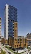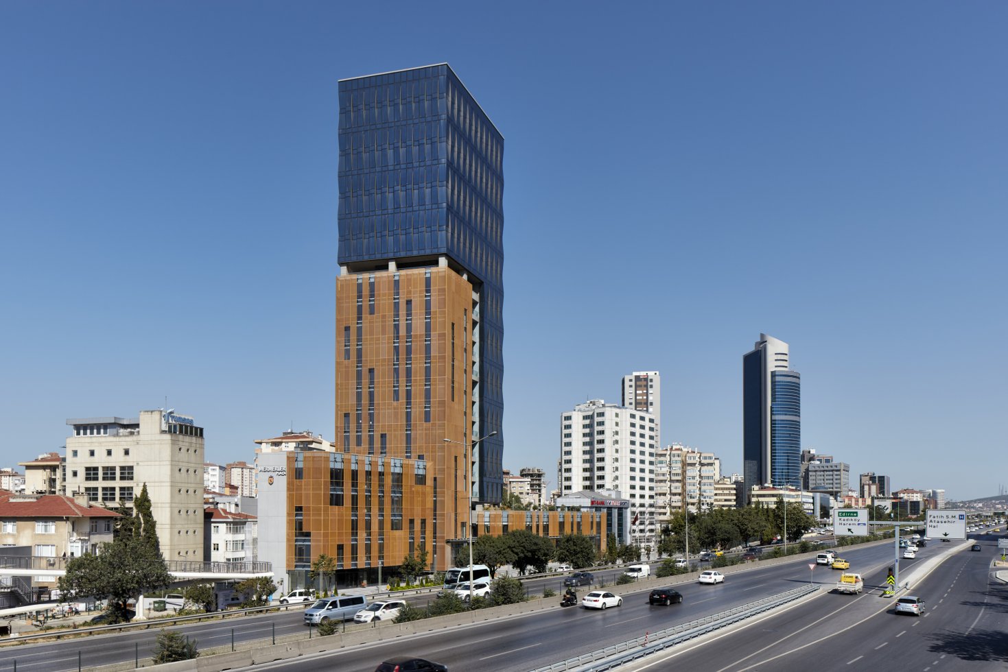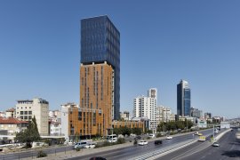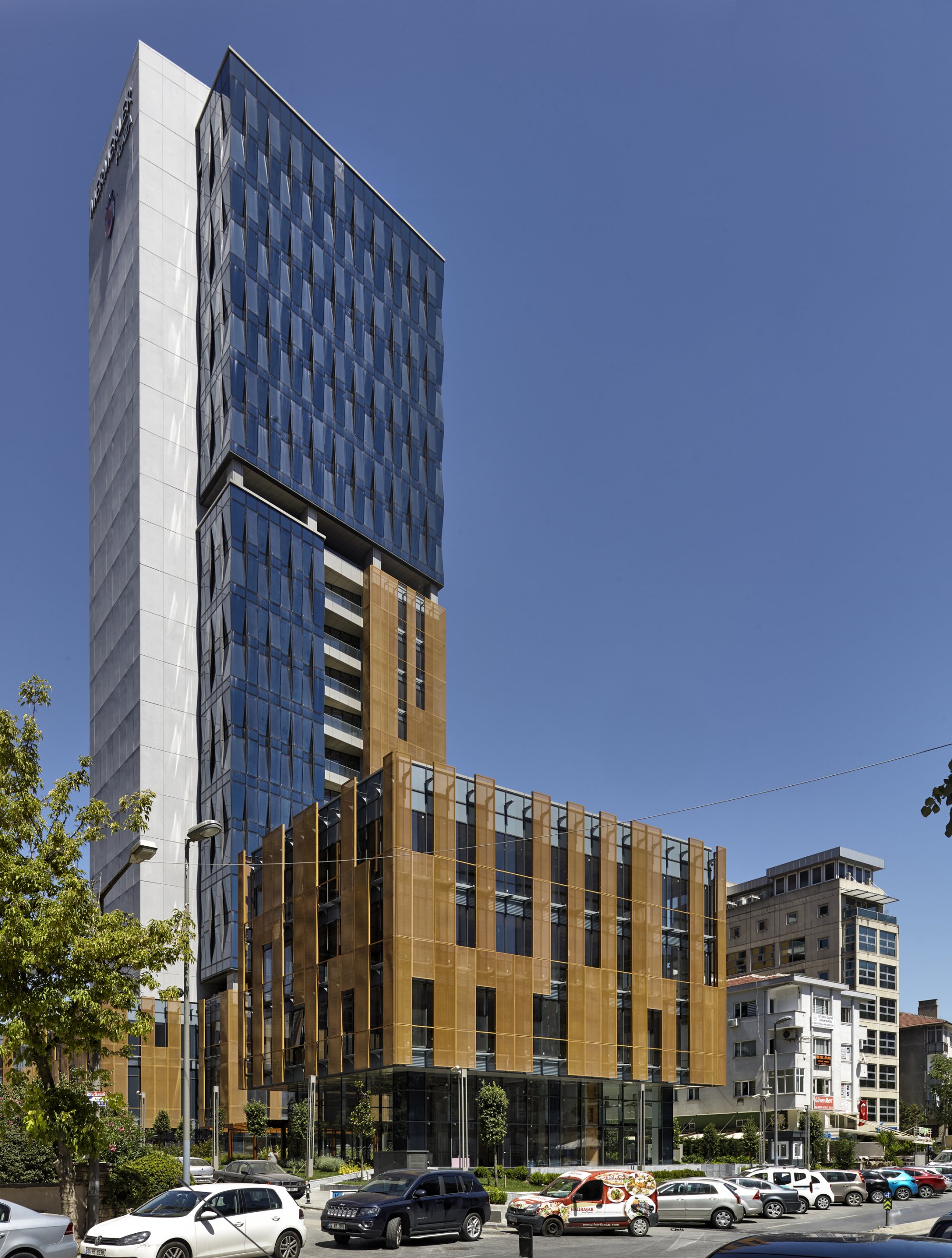 This parent-child building duo is located in the Kozyatağı district of Istanbul. The tall wavy glass walls provide a playful contrast to its shorter aluminium enveloped counterpart. In order to preserve the southward looking façade from the sun, the design incorporates randomised tan colored sun blockers made from perforated aluminium sheets.