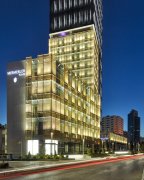 Mermerler Plaza is beautiful at night. The night-time lighting gives a day-time feeling. Blue waves are emphasised by cool hidden lights that pool in triangled shapes. Perforated mesh walls are illuminated with wall washer lighting producing a captivating soft warm glow that wraps around both buildings façades