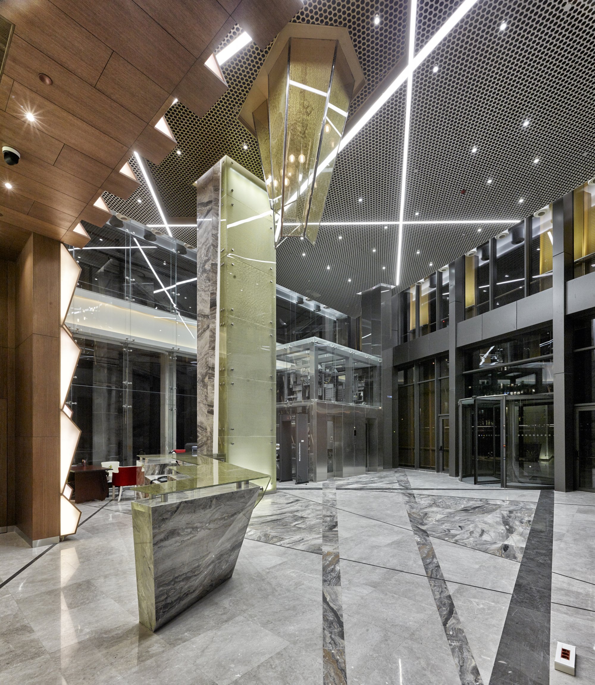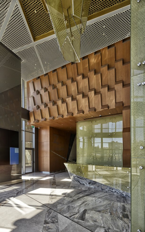 The interior architecture boasts modern geometrical designs, often mimicking the same motifs from the building’s exterior. The interior finishes as such consist primarily of triangle shaped waves that are emphasised by hidden lights and aluminium perforated sheets used to drape the entrance ceiling. Contrast between the marble flooring and the glass walls enable the building to breathe without becoming a bore. An angularity ricochets down hallways, into restrooms, lighting fixtures, meeting rooms, and right back out the front foyer reminding us that the buildings interior run just as fluid at it’s wave encrusted exterior.