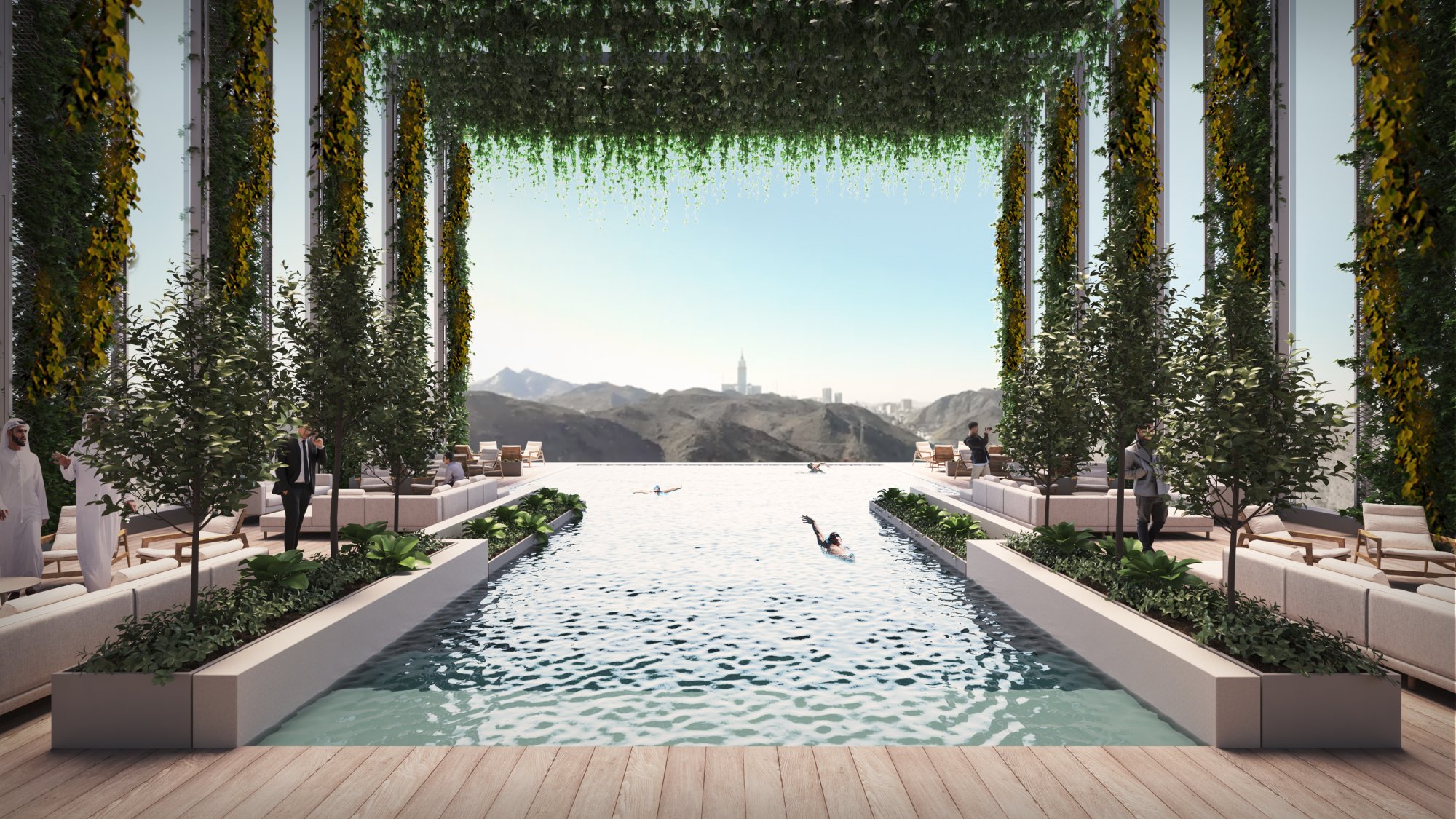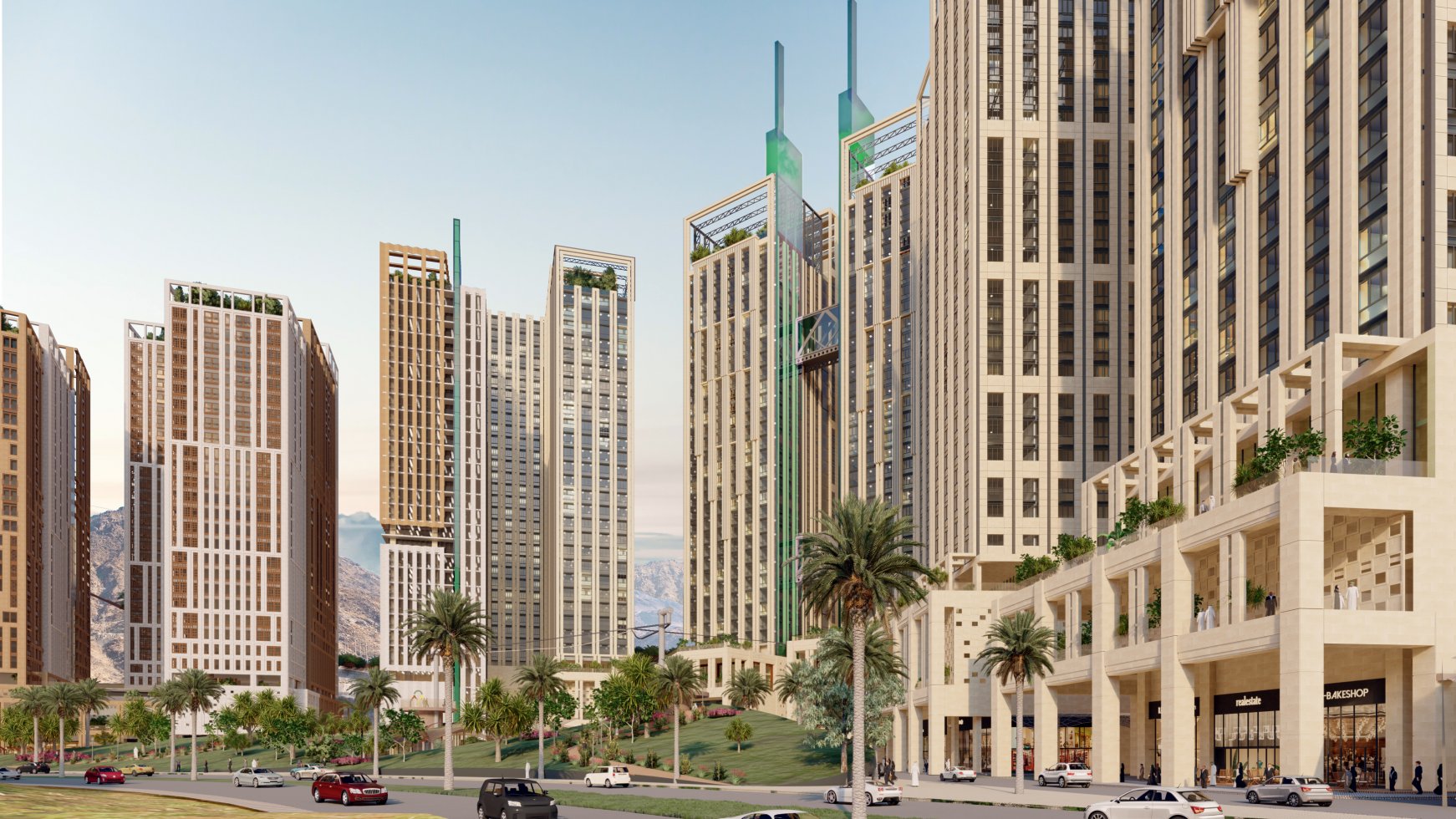 Bulvar boyunca bulvara dik olarak planlanan konut blokları, rüzgarı içeri alırken avlulu yapısı ile gölgeli açık alanlar yaratır. Bulvarın kıvrıldığı kısımda konumlanan otel blokları ise arsaya ışınsal olarak yerleşir, odağına Kabe’yi ve Makkah Clock Royal Tower’ı alır. Yapılar bu ışınsallığın simetri aksına doğru yükselerek şehrin kutsal merkezine atıfta bulunur ve aynı zamanda talep edilen simgeselliğe ulaşır. Yerleşkenin merkeze doğru yükselen silueti, teraslı mimariyi destekleyen makro formu oluştururken projenin ikonik duruşunun da kaynağıdır.